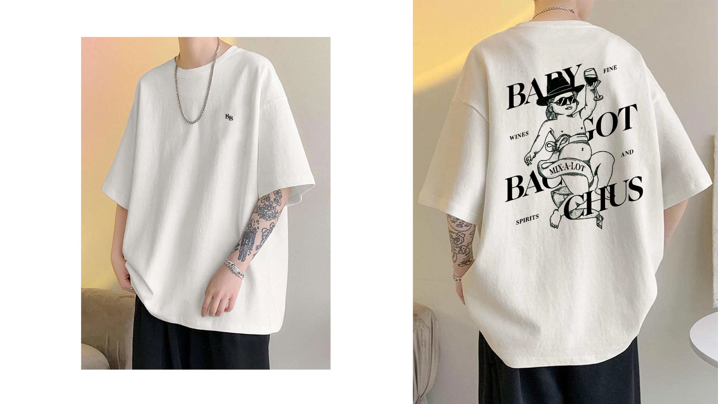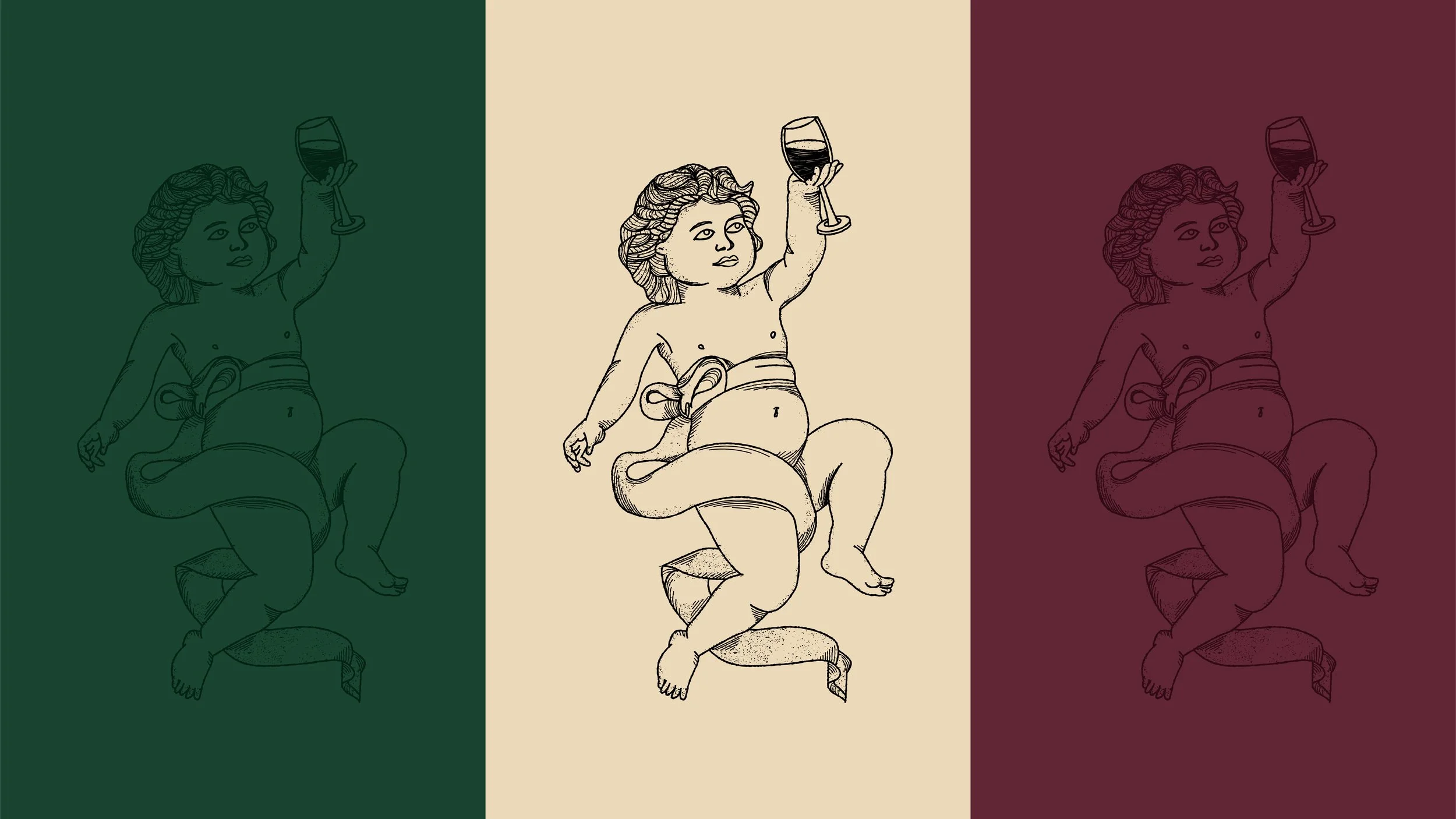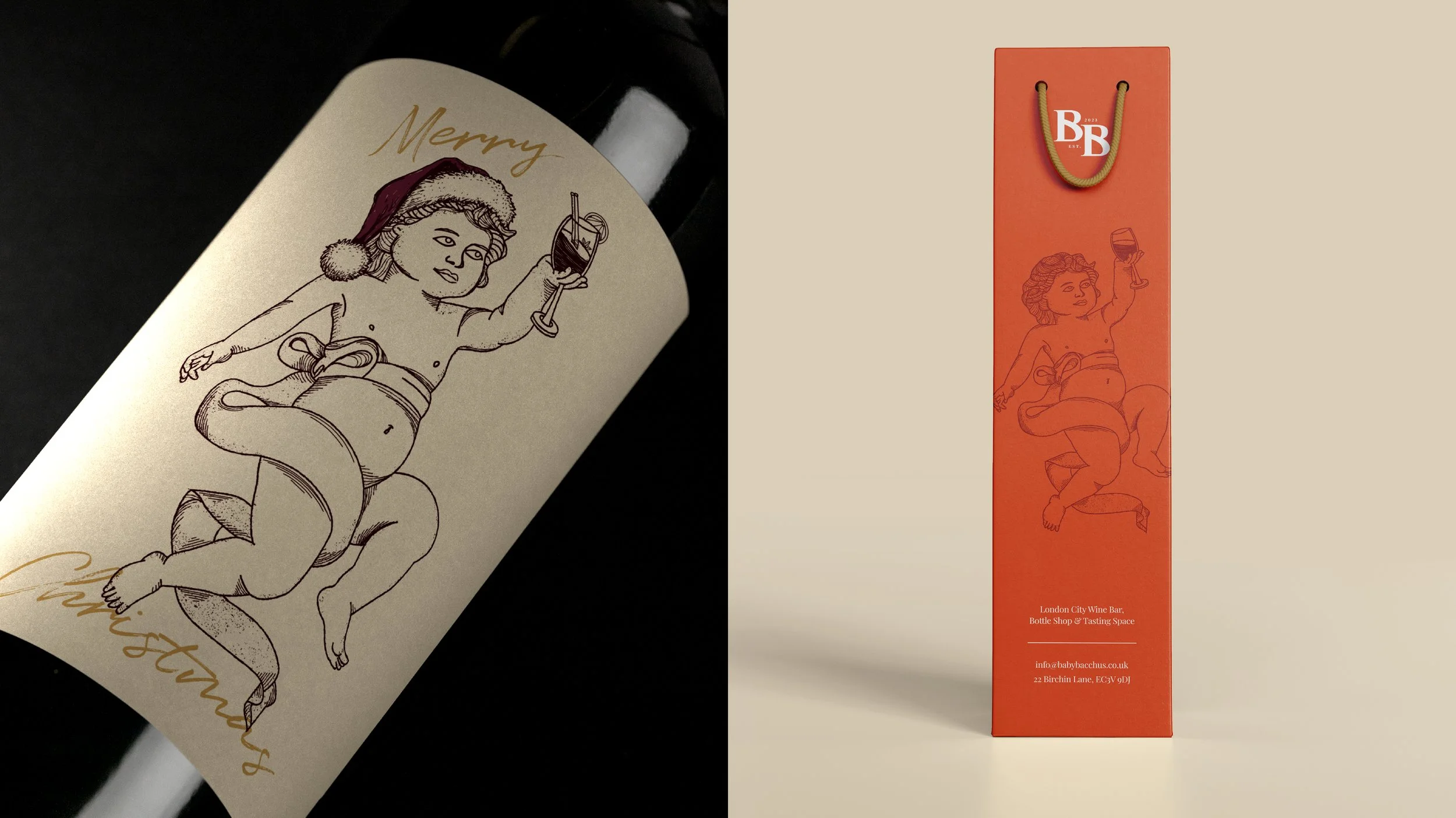A lot of time went into crafting the Baby Bacchus logo, plenty of font exploration, bespoke monograms, hidden detailing and finishing touches. We landed on the concept of the arc, a subtle nod to greek/roman mythology which was also reinforced by the introduction of the brand mascot, an original illustration linking the narrative of the name to the aesthetic of the brand.